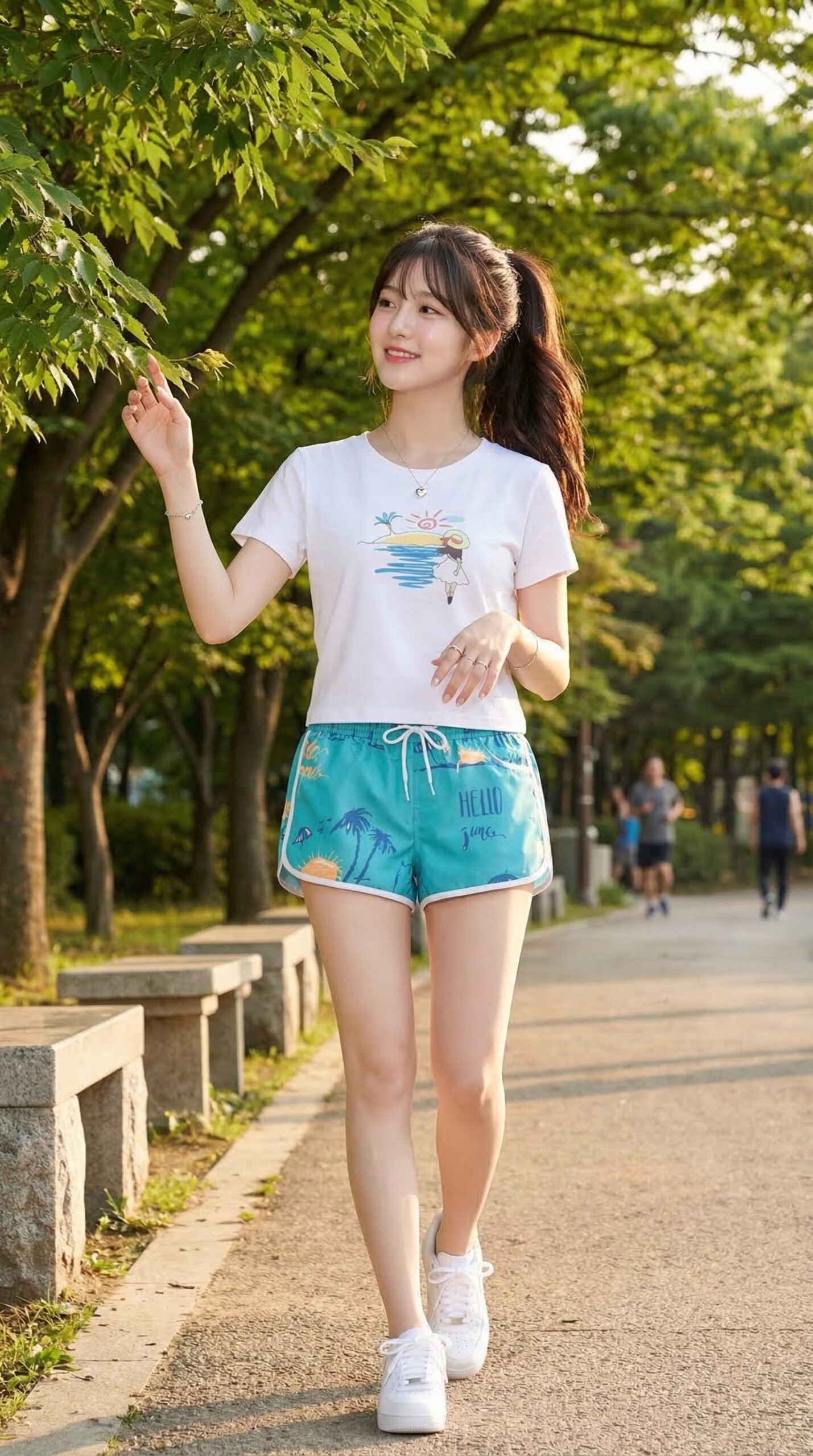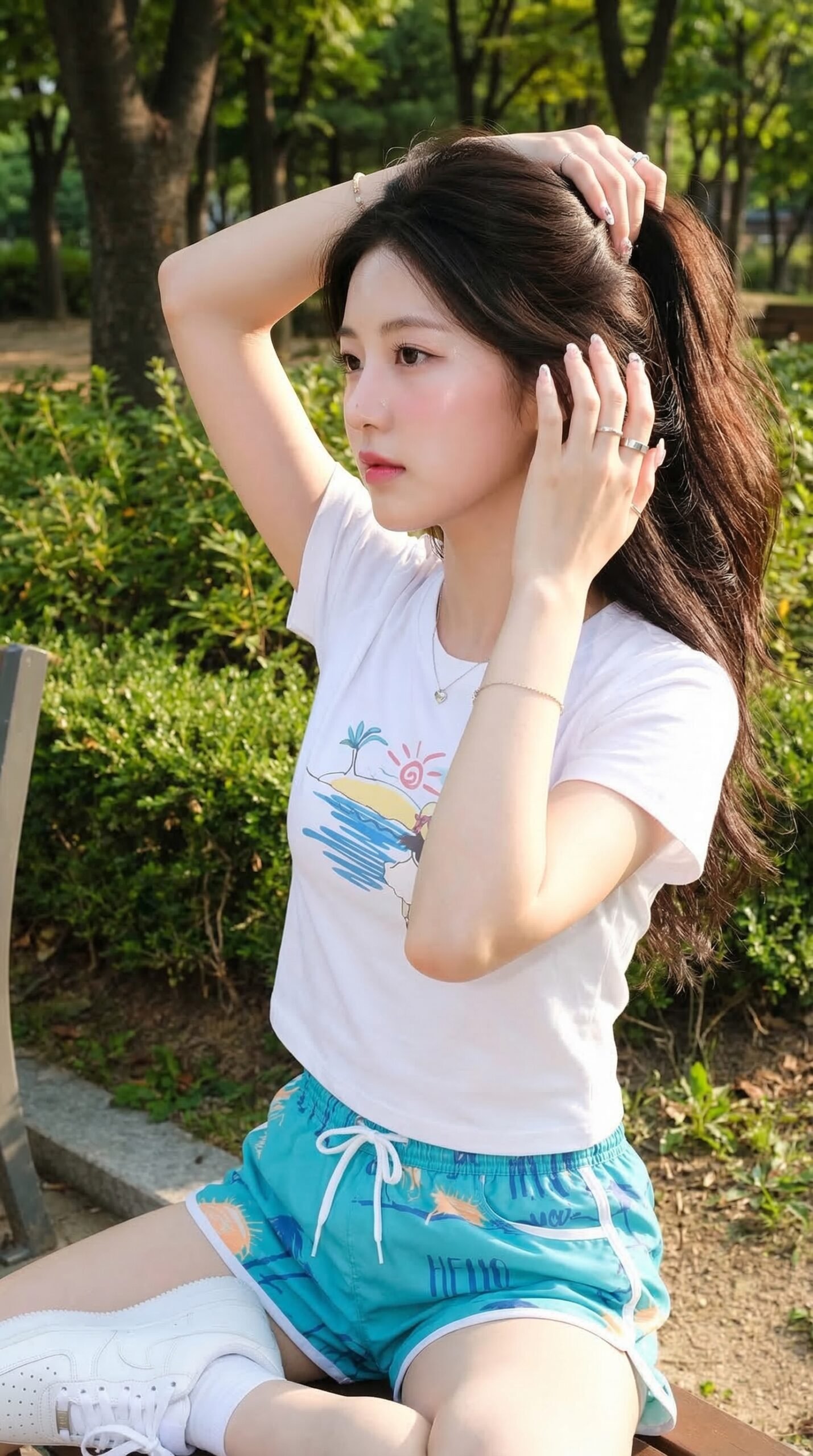 Poses: She is sitting at the edge of the park, her hair tied up with both hands. She is wearing pristine white sneakers.
