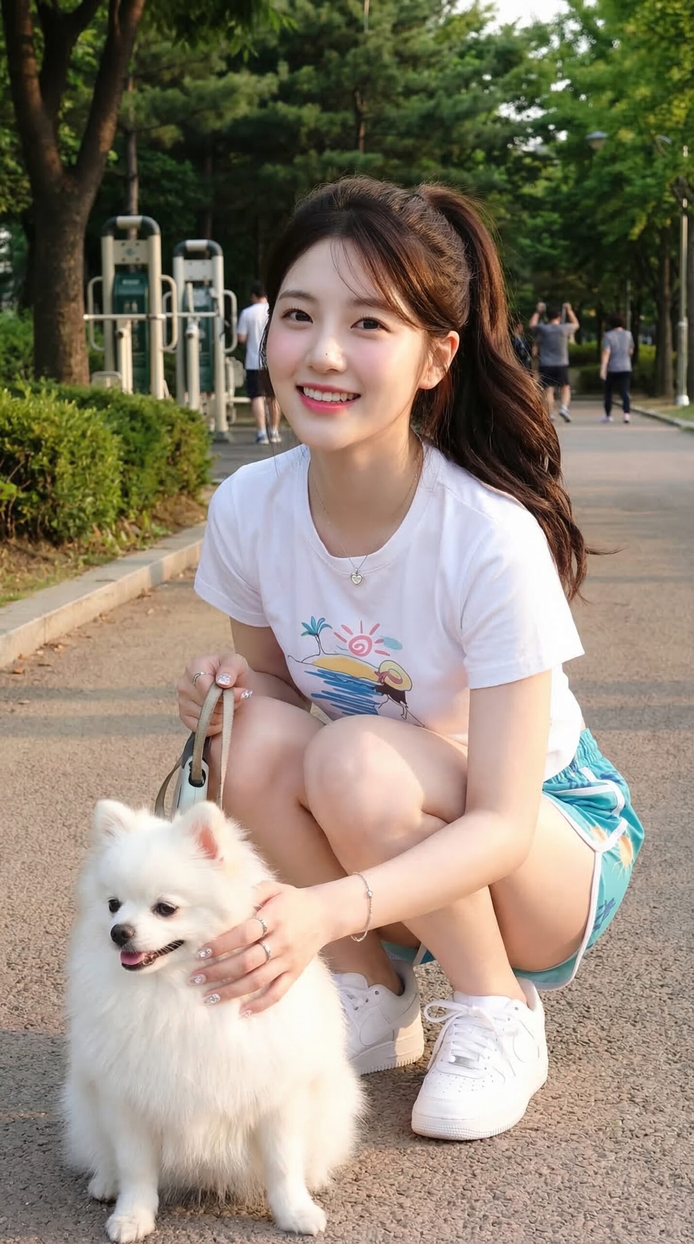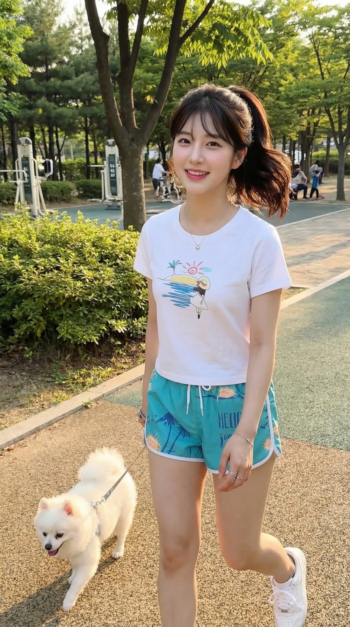 Position: She is walking her pet on a park path, her feet stepping forward, one hand holding the leash, the other relaxed, her face turned towards the camera, a bright, pretty smile on her face.