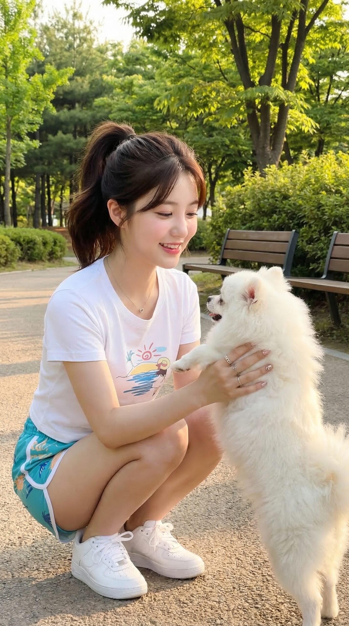 Position: She is sitting and playing with her pet on the edge of a park path, squatting with her legs together, her hands supporting the dog's front paws as if surprised, her face looking towards the dog, a gentle, pretty smile on her face.